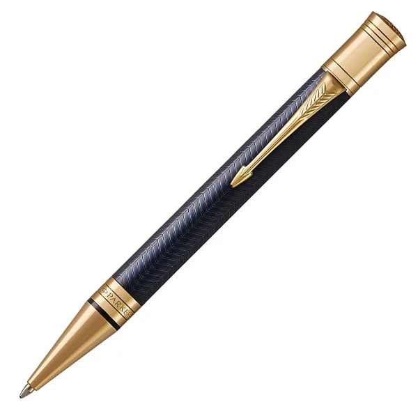 Craftsmanship Meets Legacy The Parker Duofold Prestige Blue Chevron Gold Trim Ballpoint Pen is not just a writing instrument; it’s a piece of history. Since 1921, the Duofold has been a symbol of excellence, embodying Parker’s commitment to superior craftsmanship. Each pen is a testament to meticulous attention to detail, from the emblematic ace design on the 18-carat solid gold nib to the lustrous precious metal finishes.